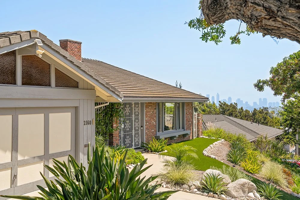 Offered by the family of the original owners is this single level, Contemporary gem in the Los Feliz Estates. The well proportioned floor plan featuring 3 bedrooms, including Primary and Guest suites, 3 bathrooms, formal dining room, generous living room with fireplace, laundry room and wood-paneled den with fireplace, wet bar and a slider that leads out to a side patio affording peek-a-boo views of the DTLA skyline. The Primary suite offers a walk-in closet and spacious bathroom with high ceilings, spa tub, double vanities and recessed lighting. 2-car garage with storage closets and direct entry.